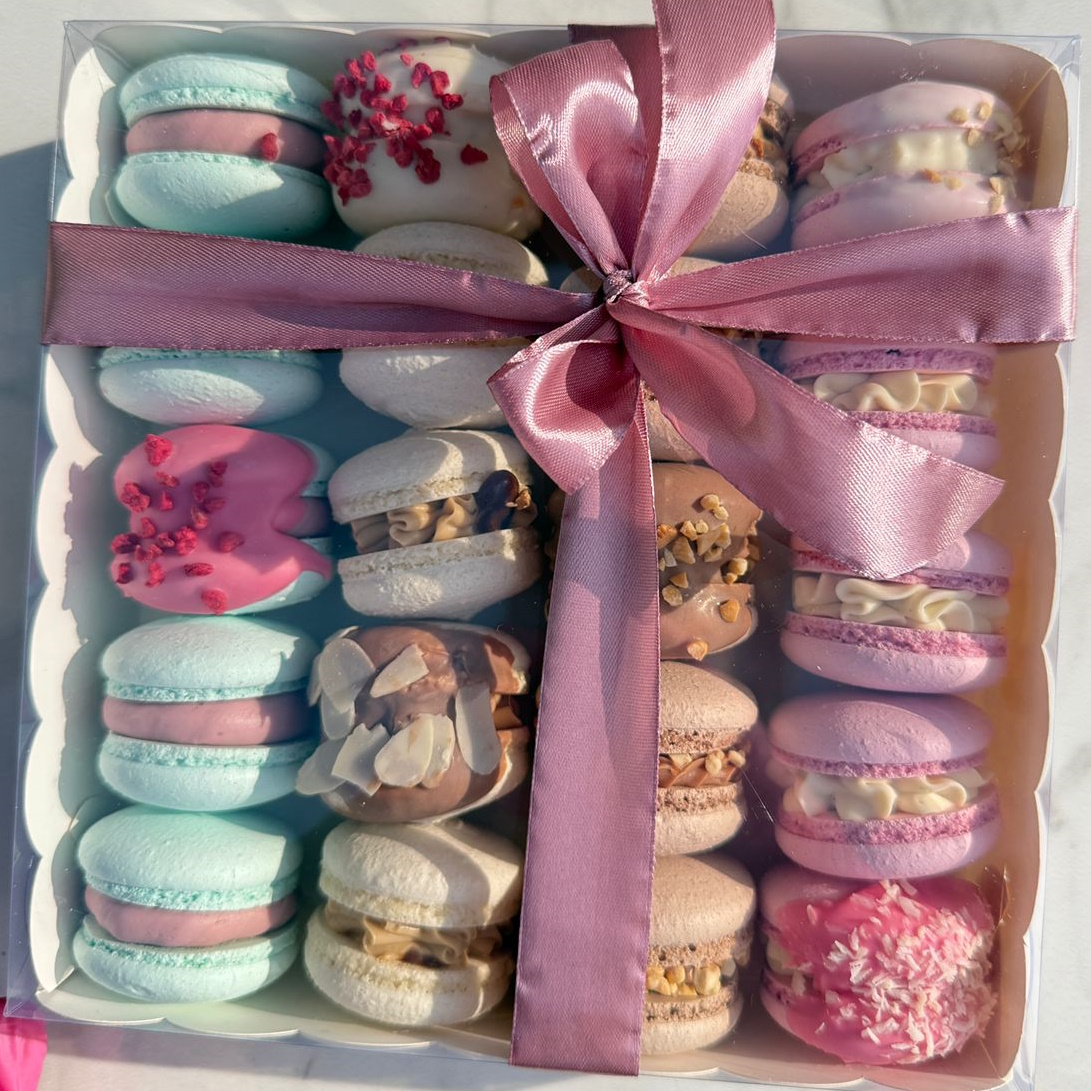Զամբյուղ զեֆիրե ծաղիկներով և մակարոններով