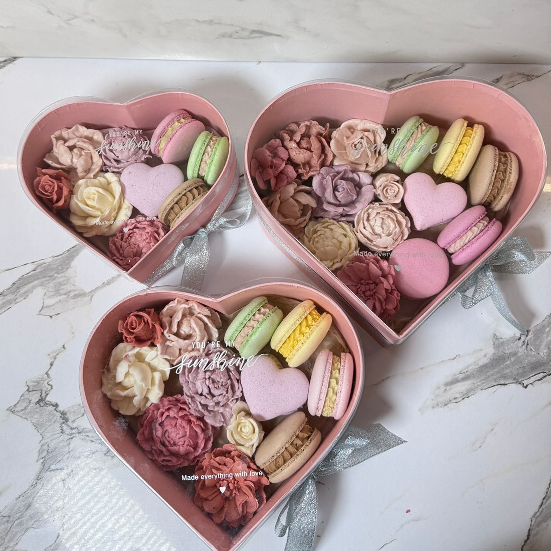 Սրտիկերի սեթ զեֆիրե ծաղիկներով և մակարոններով